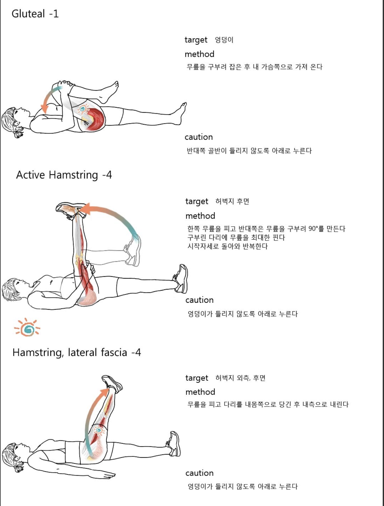 1. 무릎당기기기 스트레칭은 엉덩이 근육을 이완시켜주는데, 현재 오른쪽과 왼쪽 가동범위가 다르기때문에 통증이 없는 선에서 스트레칭 해주세요