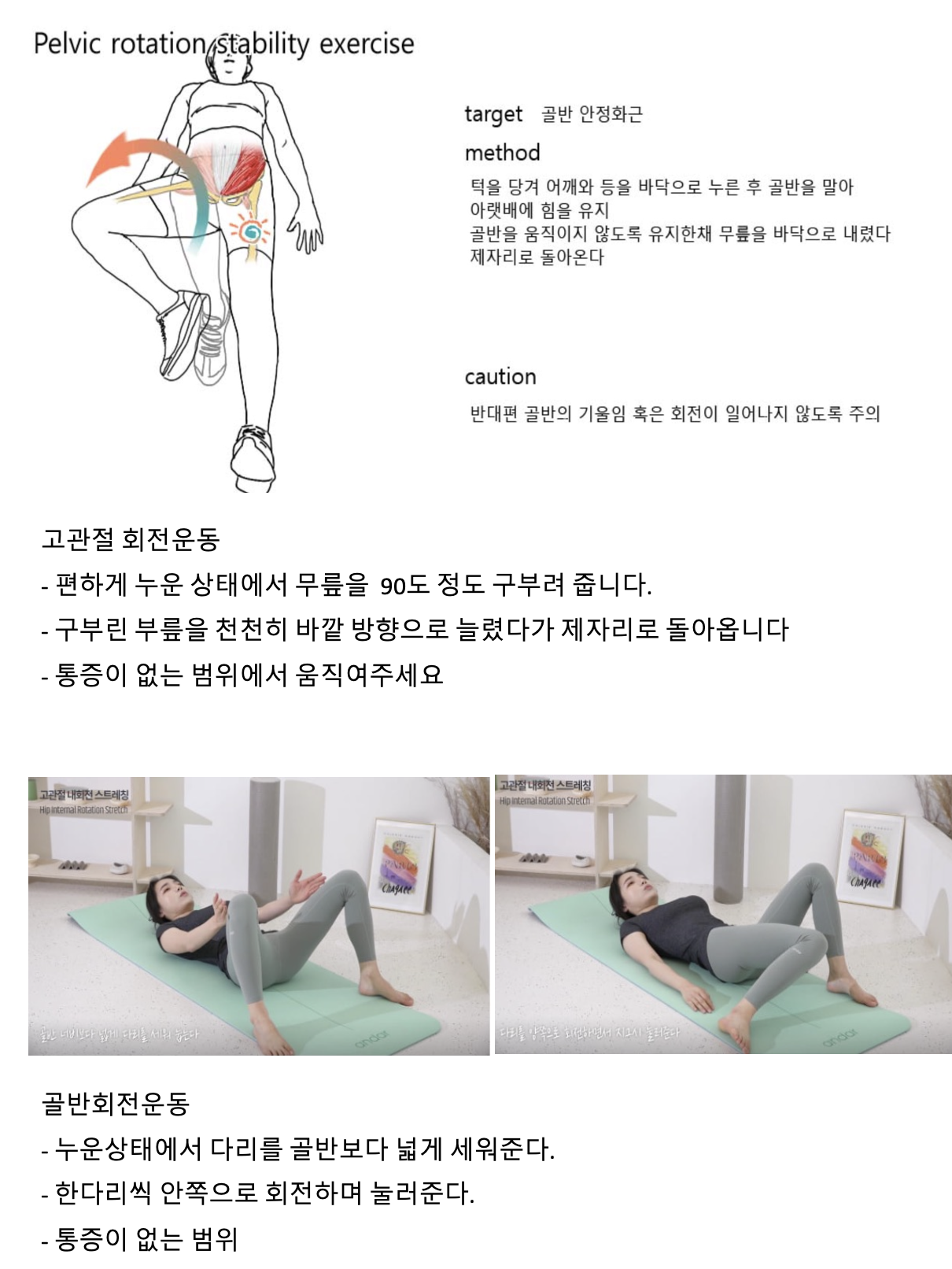 관절가동범위 측정 결과 전신 및 코어근력이 많이 약하기도 하지만, 허리관련 운동을 하기에 앞서 고관절의 움직임을 향상시켜주는 것이 좋선행되어야 한다고 생각 됩니다.