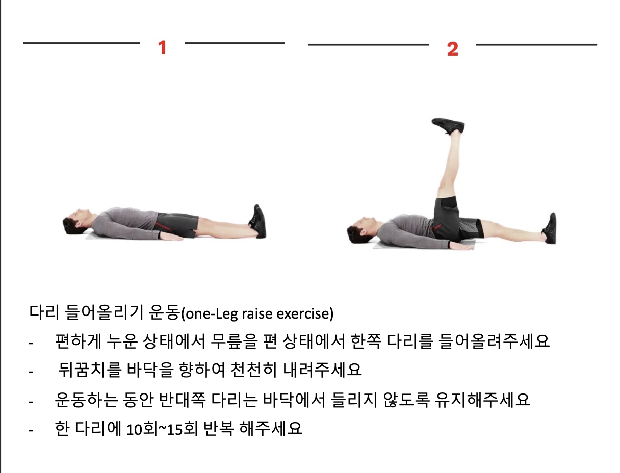 다리 근력 및 코어 기초 운동으로 운동하는 동안 허리가 들리지 않도로고 복부와 허리에 힘을 주면서 천천히 해보시길 바랍니다.