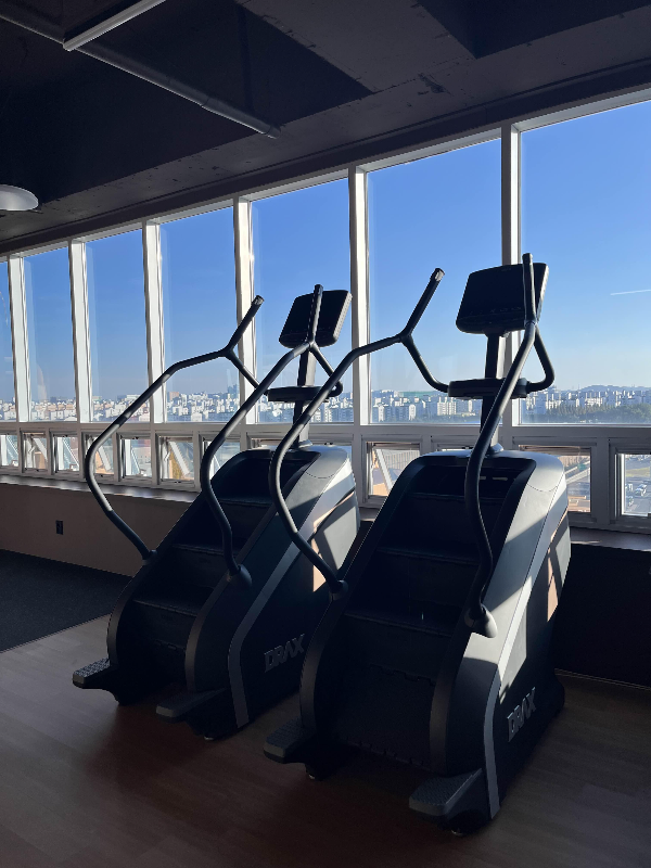 창가라인으로 유산소 운동기구가 배치되어 탁 트인 뷰를 바라볼 수 있으며 자전거 라인에서는 송도가 보이며 야간에 더 이쁜 뷰를 볼 수 있다.