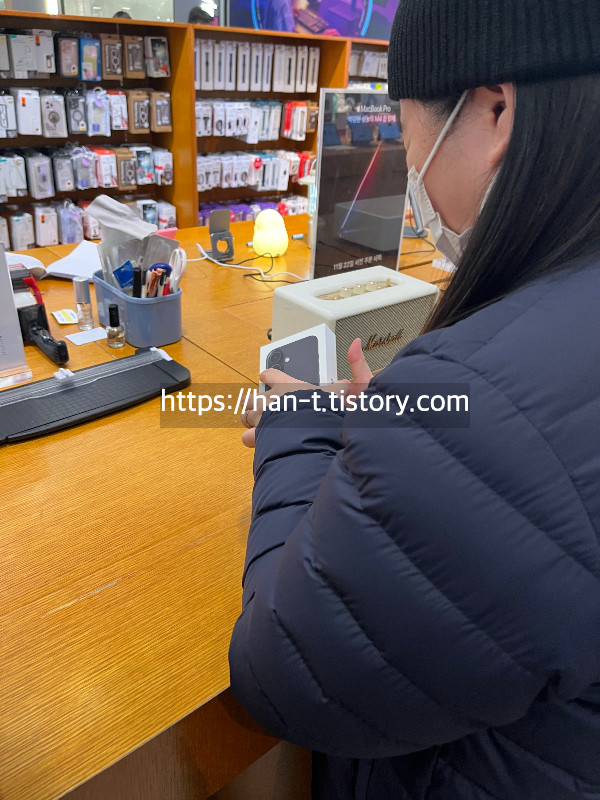 진열장안의 아이폰 디자인을 보면서 마지막으로 색상과 용량을 선택하며, 직원분이 열쇠로 문을 열고 제품을 보여주면서 결재