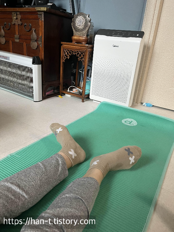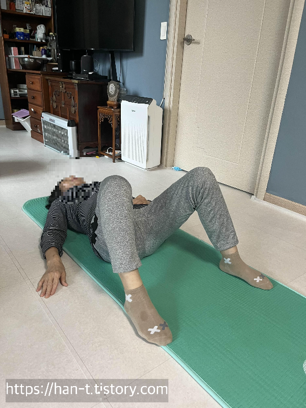 - 주의사항: 뒤꿈치 닿기 운동을 하는 동안 허리가 바닥에서 들리지 않도록 배에 힘을 잘 주셔야 합니다.