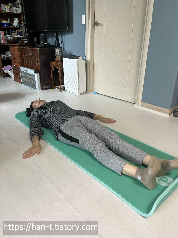- 똑바로 누운 상태에서 다리를 어깨너비보다 넓게 다리를 놓아주세요