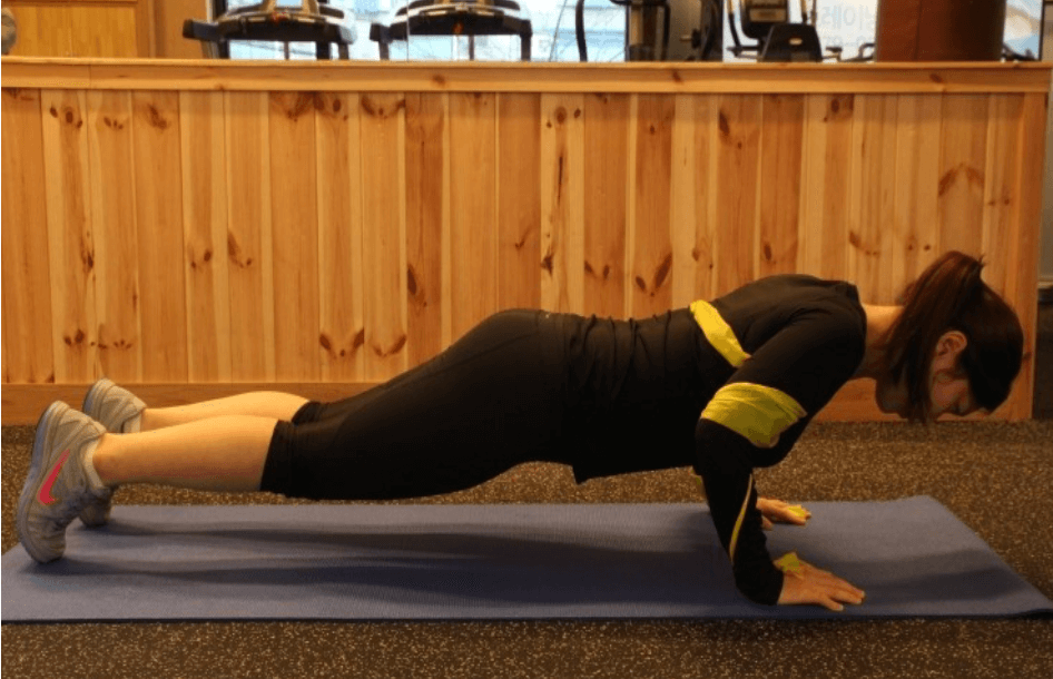 밴드를 사용한 푸시업, 로운 동작은 상체와 하체를 동시에 사용하기 때문에 전신운동의 효과가 있습니다.