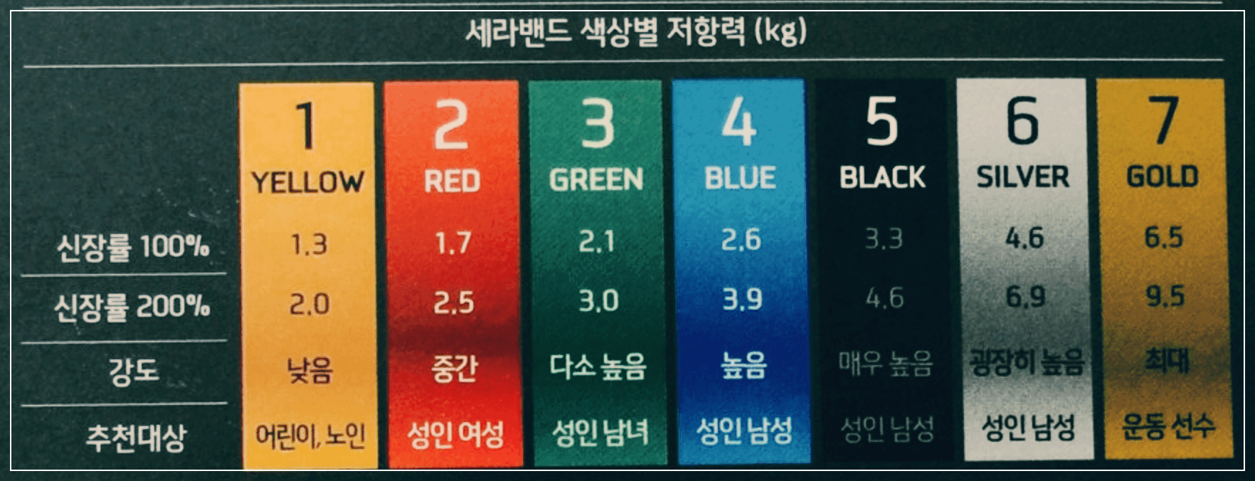 검은색~주황색은 엘리트 운동선수들이 훈련 시에 많이 사용하며 일반인들은 이 색상까지 갈 일이 거의 없다.
