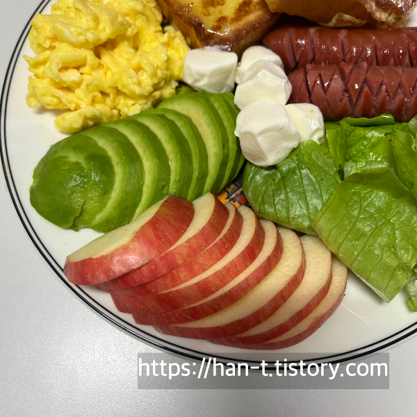 건강을 생각해서 혈당스파크를 예방하는 양상추와 사과 그리고 아보카도를 추가하여 오늘의 식사는 브런치로 맛있게 먹었습니다.